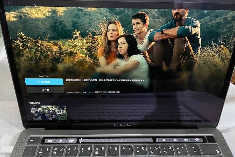 MacBook Pro 13 也承接以往,同样有 Touch bar(触控列),会因应你正在执行的应用程式,串连巧控键盘直觉性操作。比如:我在看 Apple TV+,触控列有调整音量、或播放、前转、後转、暂停等功能,可以直接操作,很方便。