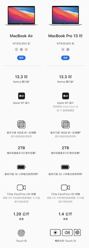 这次我因旧款 Mac Air 坏掉,紧急寻找新笔电,才发现 Apple 2020/11 推出自家首款 M1 晶片 MacBook Air、MacBook Pro 13,代表处理效能更快、也更省电。也因长期使用苹果笔电,仅花一个晚上评比後就购买,这篇简单分享两台的差异性吧。